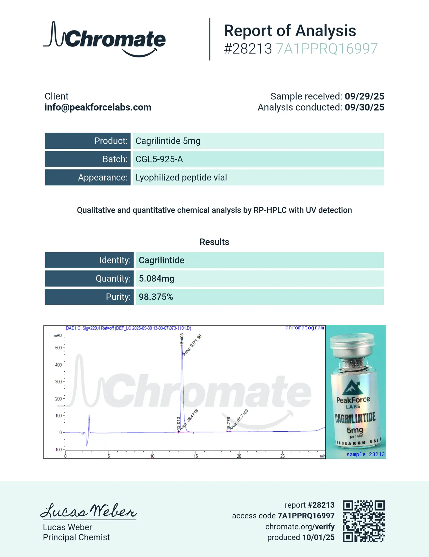 At PeakForce Labs, quality is our cornerstone. This white lyophilized powder is the result of state-of-the-art freeze-drying, ensuring stability and ease of reconstitution. Every batch is tested in the USA to guarantee a minimum of 99% purity, ensuring your data remains uncompromised by contaminants. Whether your laboratory is focused on metabolic rate markers, organelle-specific activity, or endocrine signaling, Cagrilintide provides a convenient, high-concentration solution for multi-faceted experimental designs.