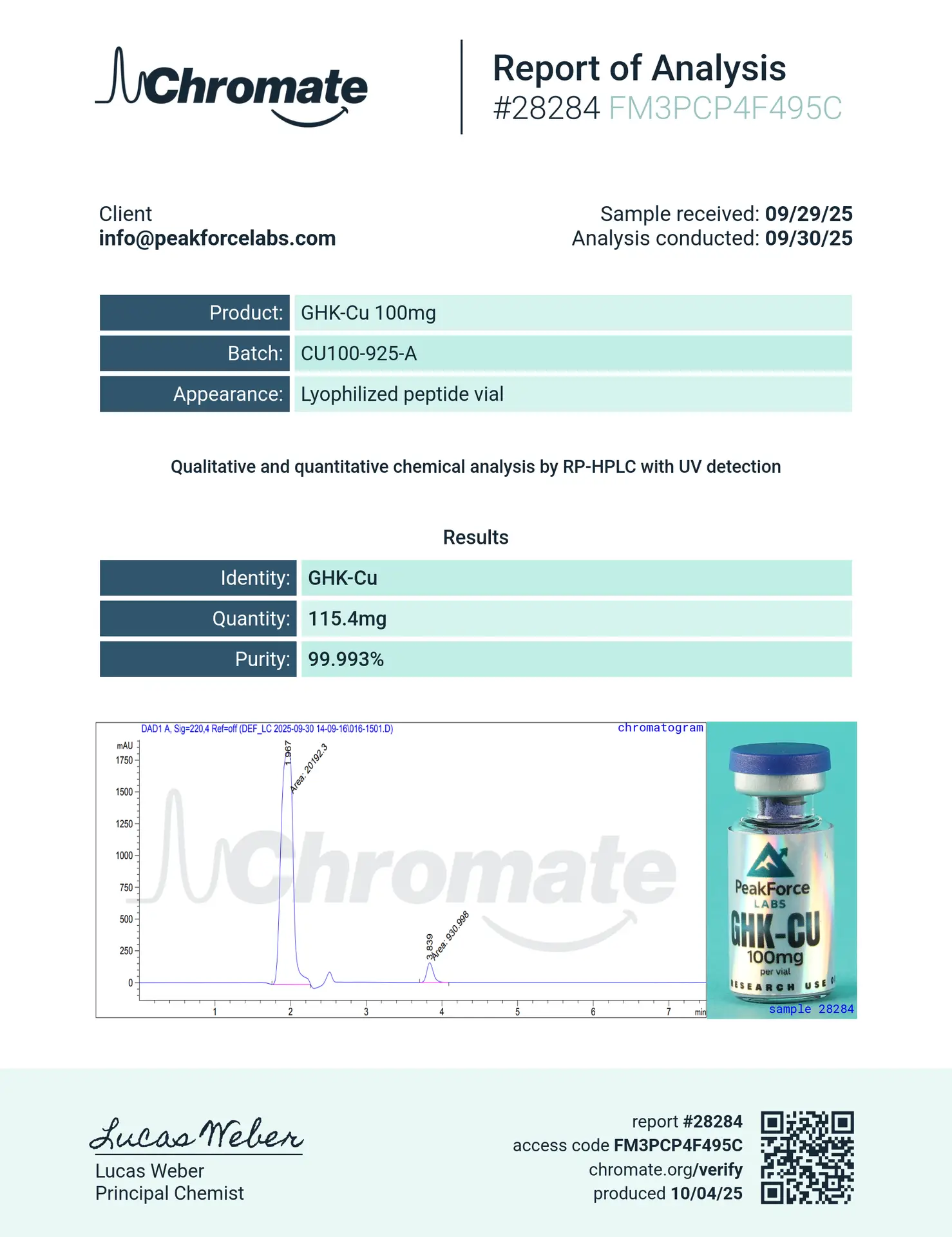 At PeakForce Labs, quality is our cornerstone. This distinctive blue powder is the result of state-of-the-art lyophilization, ensuring stability and ease of reconstitution. Every batch is tested in the USA to guarantee a minimum of 99% purity, ensuring your data remains uncompromised by contaminants. Whether your laboratory is focused on dermatological models, musculoskeletal recovery, or inflammation markers, GHK-Cu provides a convenient, high-concentration solution for multi-faceted experimental designs.