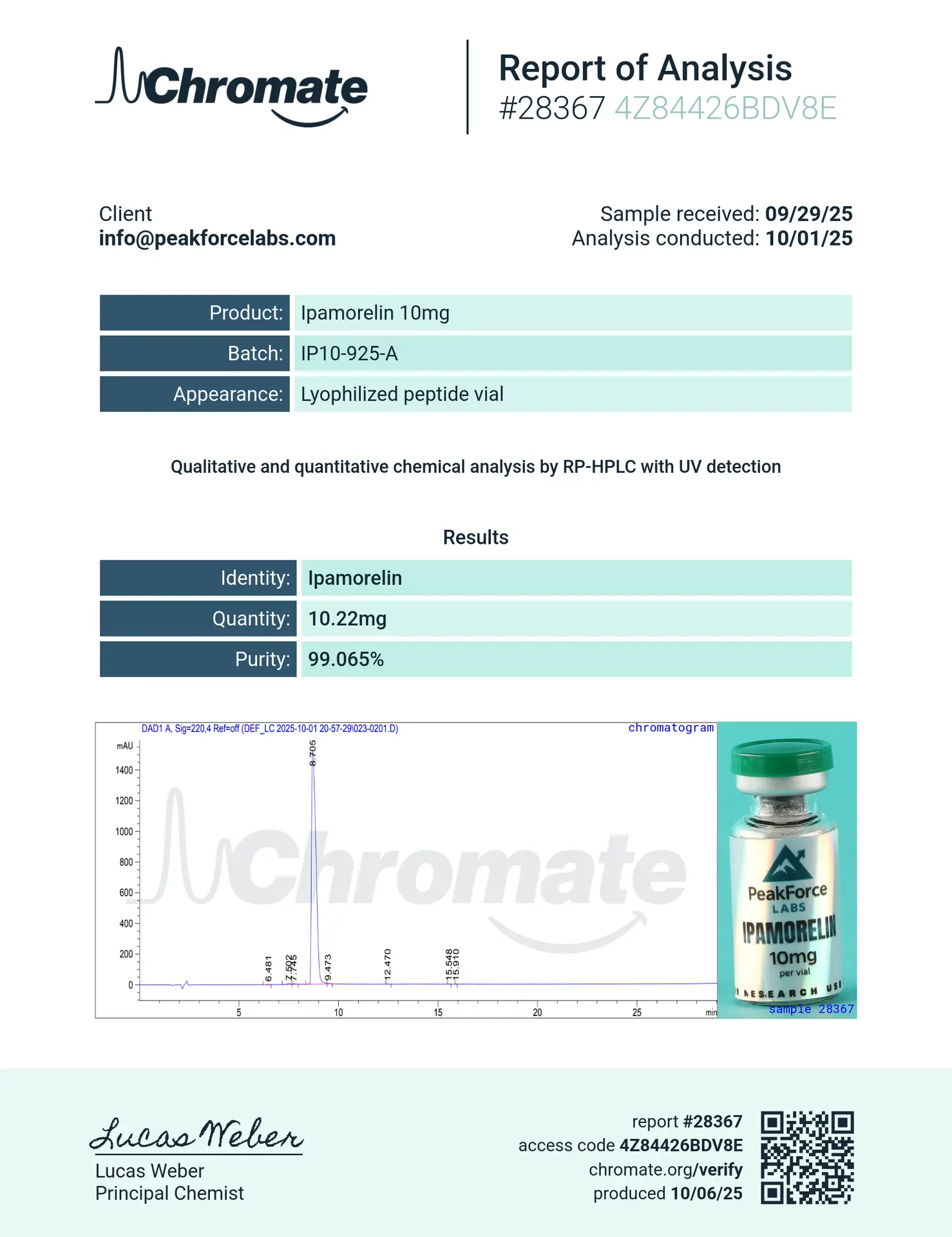 At PeakForce Labs, quality is our cornerstone. This distinctive white powder is the result of state-of-the-art lyophilization, ensuring stability and ease of reconstitution. Every batch is tested in the USA to guarantee a minimum of 99% purity, ensuring your data remains uncompromised by contaminants. Whether your laboratory is focused on musculoskeletal recovery, metabolic rate markers, or cellular aging simulations, Ipamorelin provides a convenient, high-concentration solution for multi-faceted experimental designs.