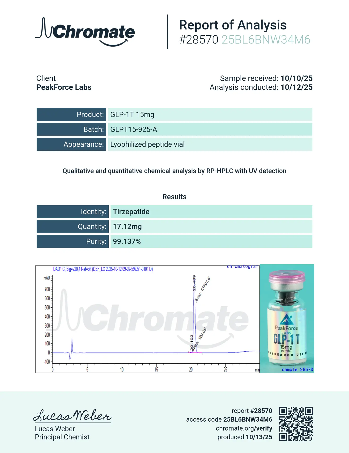 At PeakForce Labs, quality is our cornerstone. This distinctive white powder is the result of state-of-the-art lyophilization, ensuring stability and ease of reconstitution. Every batch is tested in the USA to guarantee a minimum of 99% purity, ensuring your data remains uncompromised by contaminants. Whether your laboratory is focused on metabolic rate markers, organelle-specific activity, or inflammation markers, Tirzepatide provides a convenient, high-concentration solution for multi-faceted experimental designs.