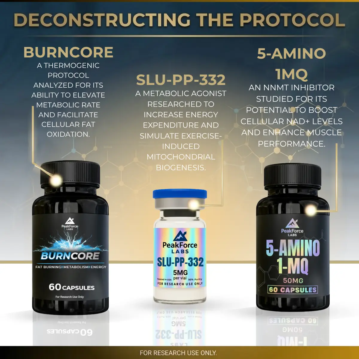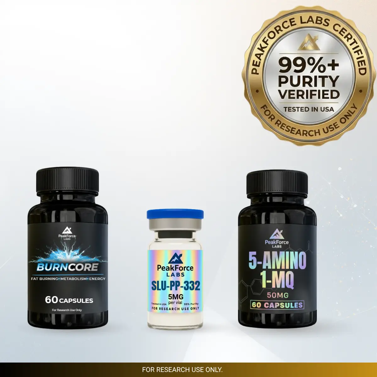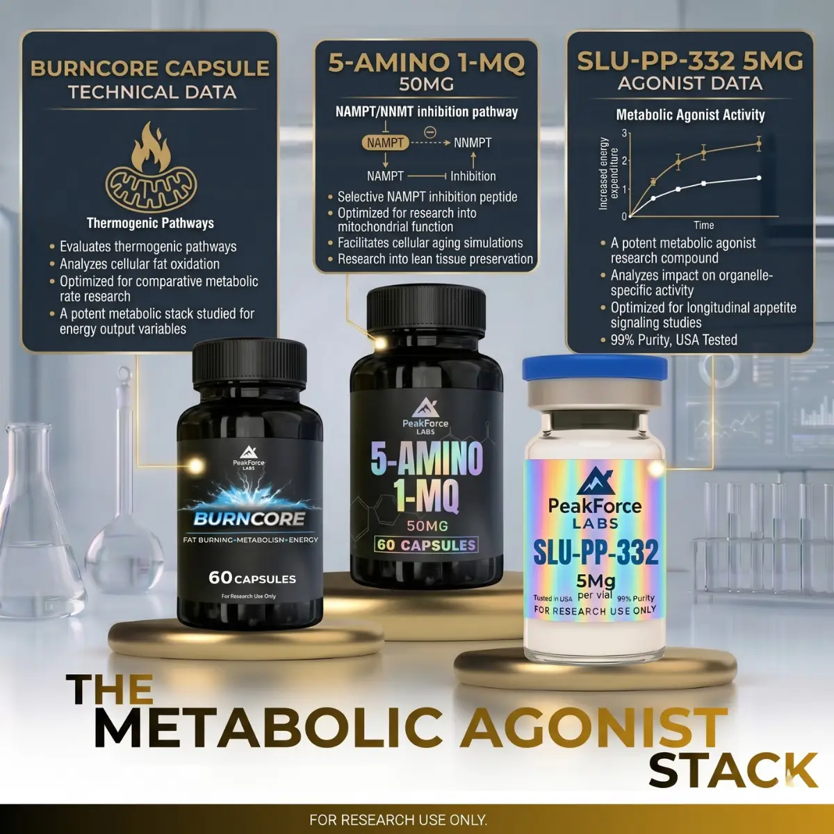 The Metabolic Agonist Stack is a high-fidelity research system engineered for the comprehensive analysis of metabolic signaling and cellular energy pathways. This integrated protocol combines three advanced research compounds—SLU-PP-332, 5-Amino 1MQ, and BurnCore—to provide a synchronized matrix for longitudinal studies.