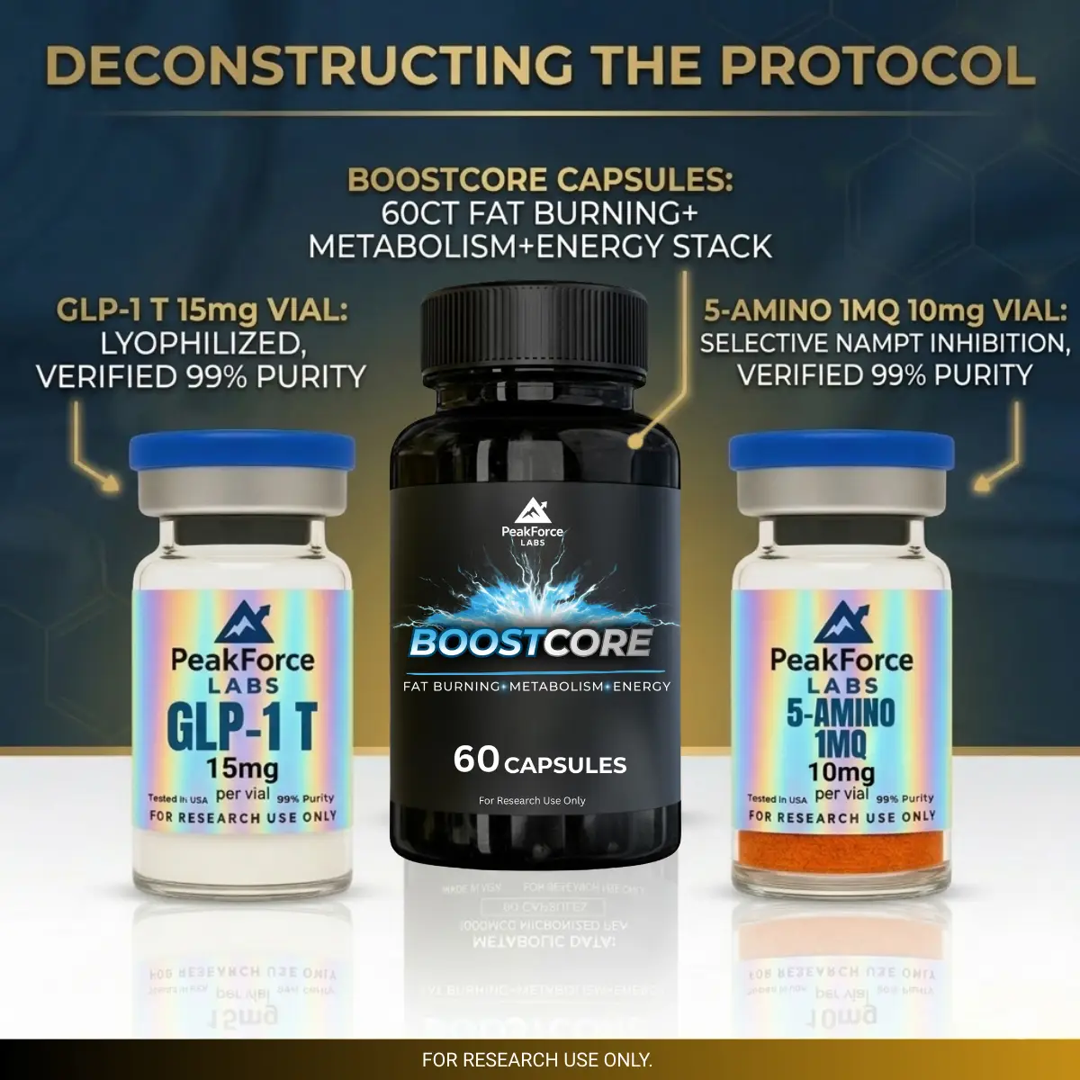 Complete 3-compound metabolic research system. Save $53 on GLP-1 T + 5-AMINO 1MQ + BoostCore integrated protocol.