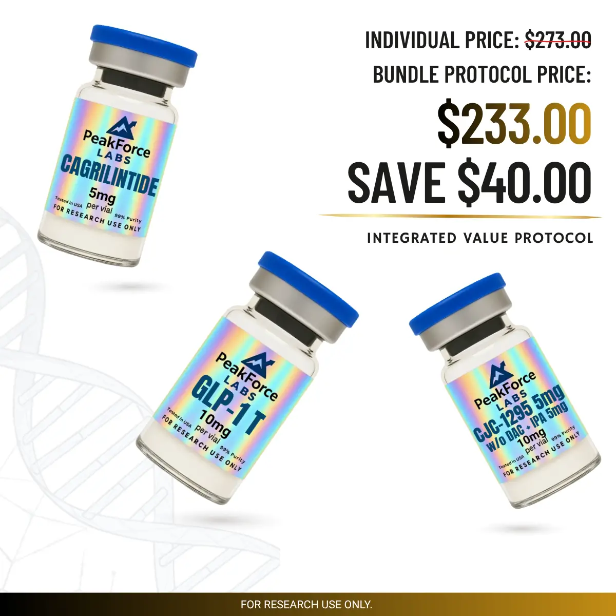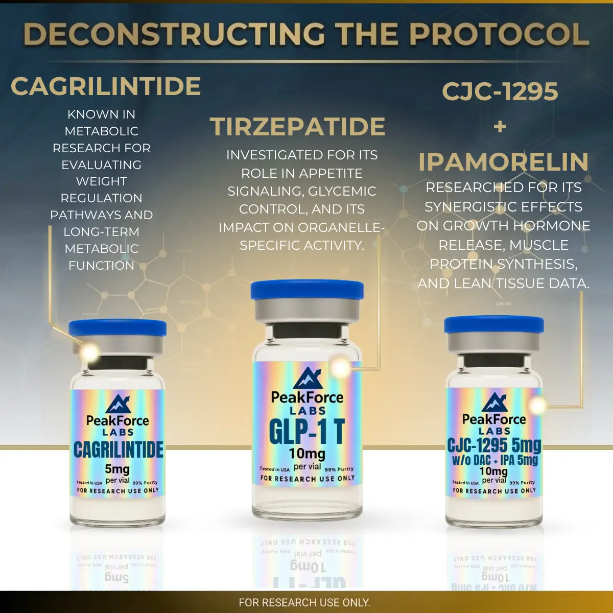 The Recomposition Stack by PeakForce Labs is a precision-engineered bundle designed for high-fidelity metabolic and hormonal signaling analysis. This comprehensive research system integrates Cagrilintide (5mg), GLP-1 T (10mg), and a CJC-1295 + Ipamorelin (10mg) stack to facilitate the simultaneous study of amylin receptor agonism, GLP-1 receptor signaling, and growth hormone secretagogue pathways. Optimized for longitudinal studies, The Recomposition Stack allows researchers to observe cellular lean tissue preservation and energy output variables with 99%+ purity-verified compounds. Eliminate procurement variables and synchronize your laboratory findings with this pharmaceutical-grade metabolic research kit.