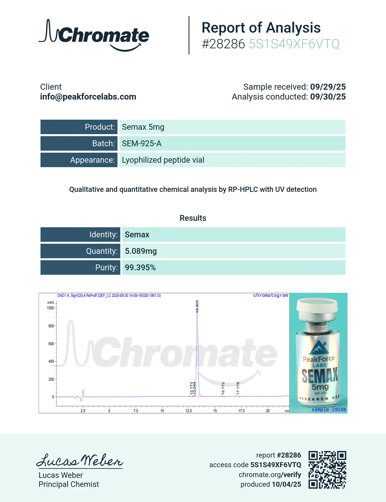 At PeakForce Labs, quality is our cornerstone. This distinctive lyophilized powder is the result of state-of-the-art processing, ensuring stability and ease of reconstitution for your precise experimental needs. Every batch is tested in the USA to guarantee a minimum of 99% purity, ensuring your data remains uncompromised by contaminants. Whether your laboratory is focused on neurobiology, stress-response markers, or cognitive function simulations, Semax 5mg provides a convenient, high-concentration solution for multi-faceted experimental designs.