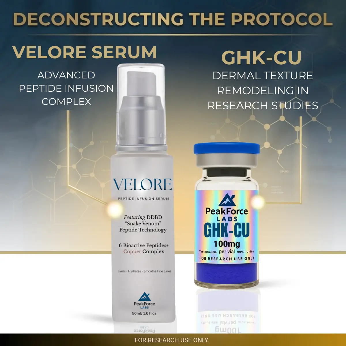 VELORE Peptide Infusion Serum (50ml): A cutting-edge topical delivery system featuring DDBD “Snake Venom” neuropeptide technology. It combines six clinical-grade peptides—including Matrixyl® and Copper Tripeptide-1—to study the visible lifting and rejuvenation of research models.
